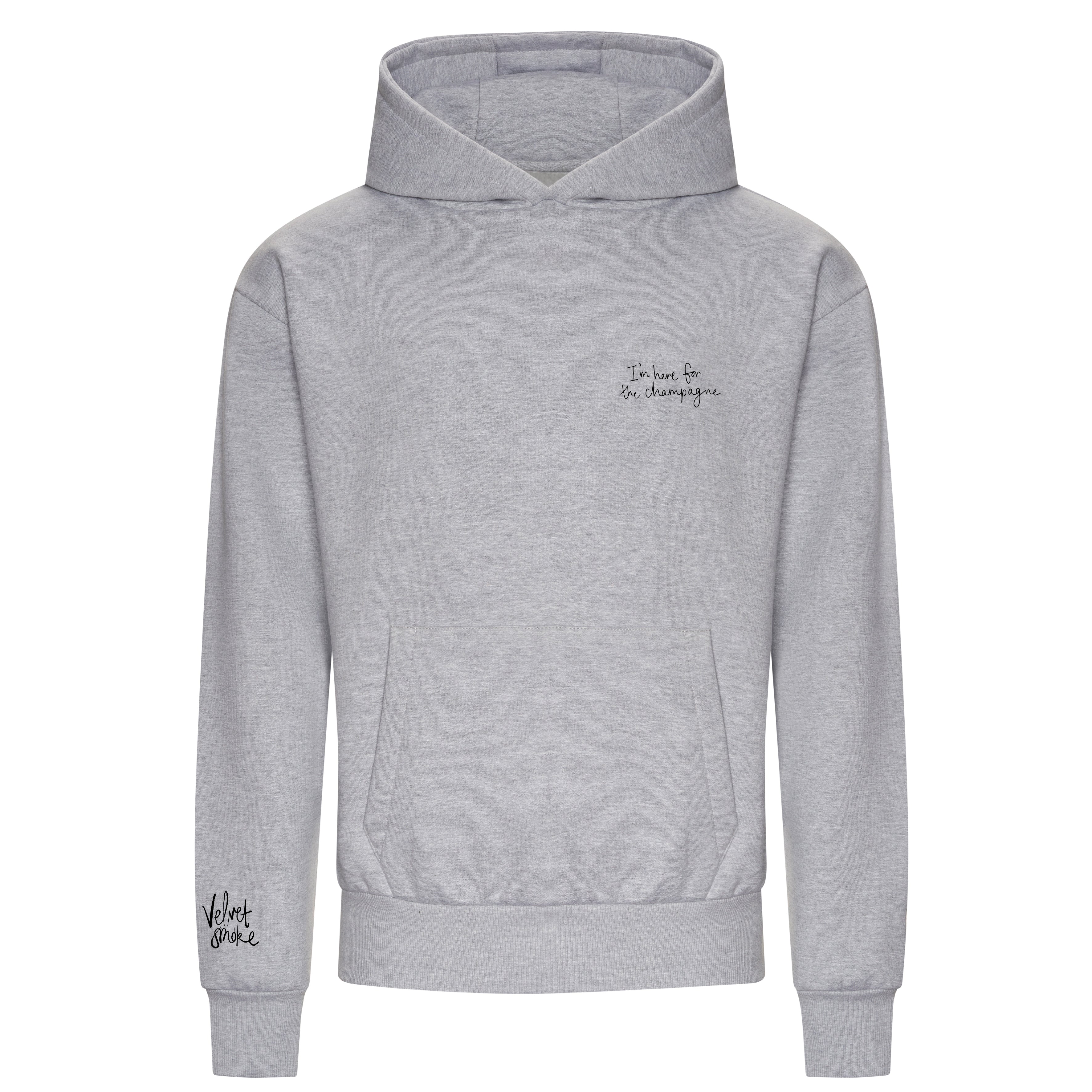 This baby is made from thick, organic cotton with a super-soft brushed fleece lining. It has a double fabric hood, a convenient pouch pocket with an inner phone pocket, and a ribbed cuff and hem. Our 'I'm here for the Champagne' slogan is embroidered on the left breast and our logo is embroidered on the right sleeve. These are so good we’ve had to hide them from our husbands!